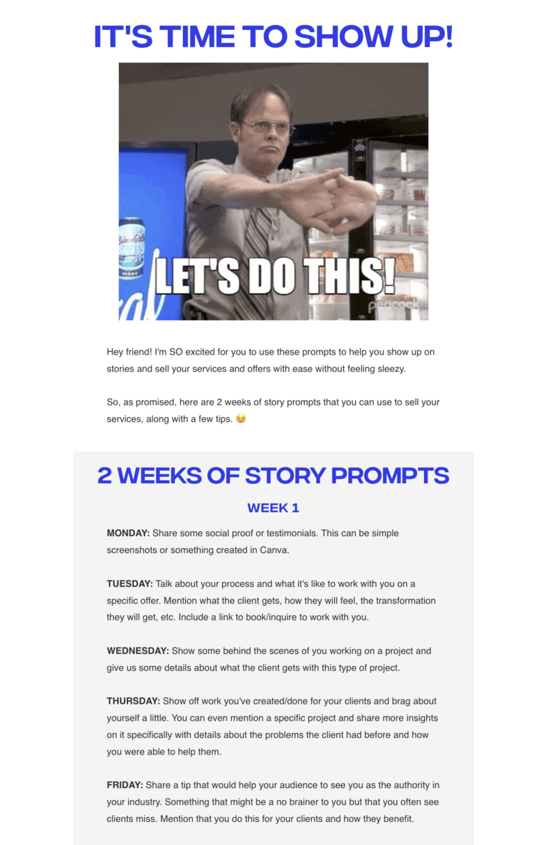 You should be selling your offer multiple times a week in your stories. I always tell my clients to share their services and how to work with them at least 2-3x a week, but honestly, you could do it daily. Think about it, not everyone sees everything you post. Only you do because we sit there and go back and rewatch our stories 10x throughout the day. Guilty as charged. 🙋♀️ Time to change that with our prompts to get you started!